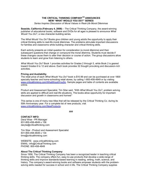 The Critical Thinking Company publishes PreK-12 books and software to develop critical thinking in core subject areas. The Critical Thinking Company publishes PreK-12 books and software to develop critical thinking in core subject areas. Critical Thinking Book 1 - Student.